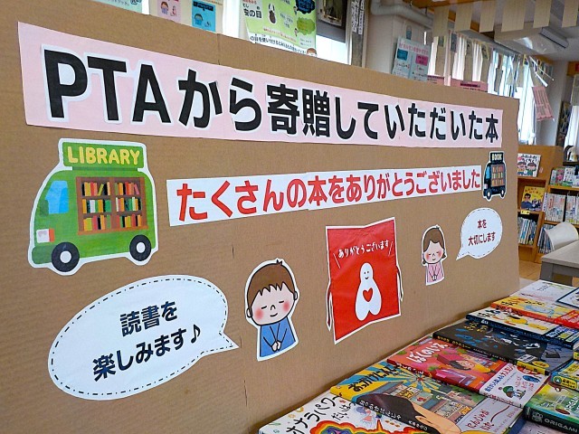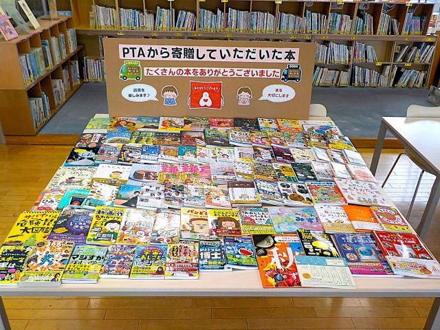 PTAのご協力で、図書室に新しい本がたくさん並びました。