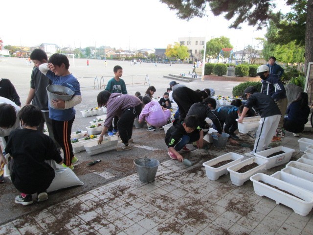 飼育栽培委員の子どもたちがパンジーの苗をプランターに植えました。