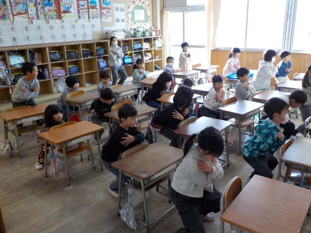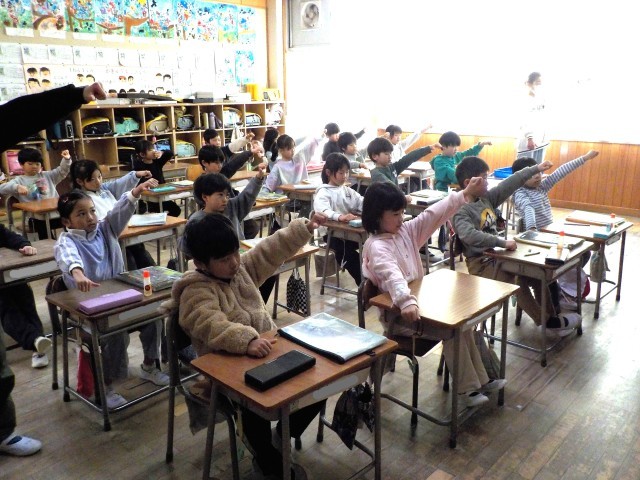 玉小では、毎週月曜日にロコモ体操&ビジョントレーニングに取り組んでいます。(写真は1年生の教室です。)