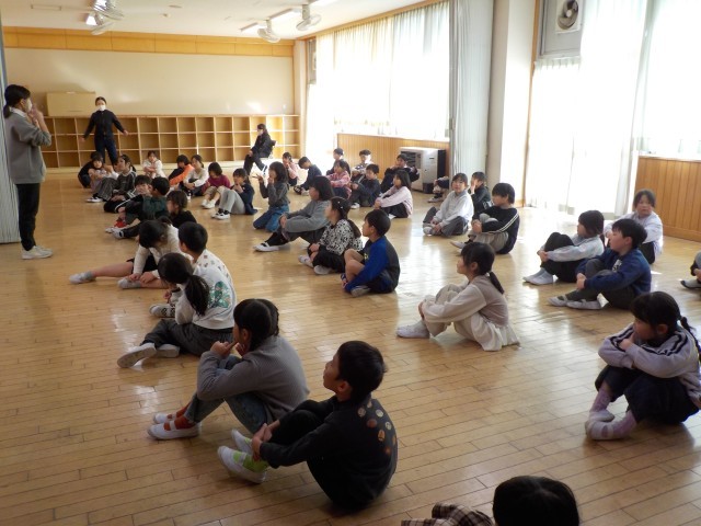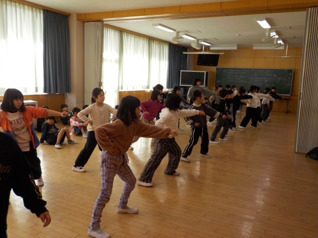 5時間目に、2年生の1・2組が多目的室に集まり、ダンスの練習をしました。