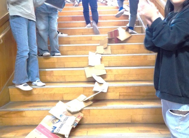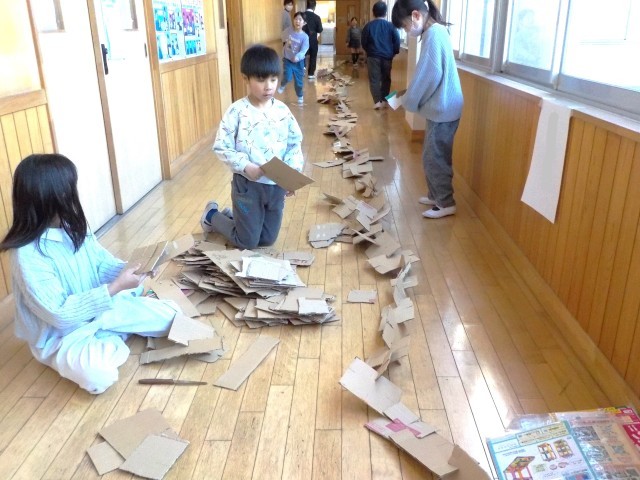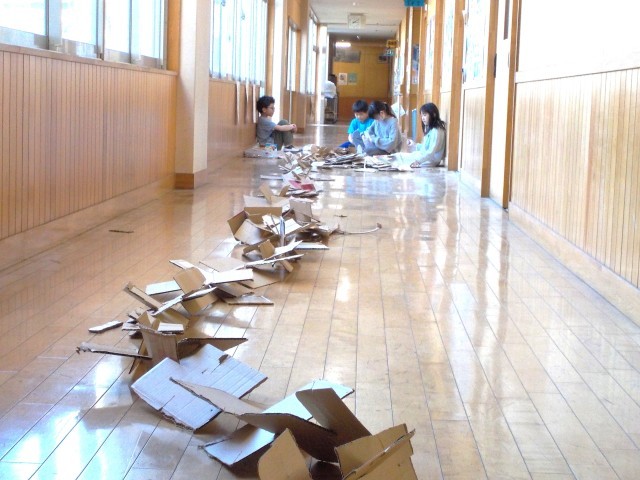 図工室から廊下をクネクネ、階段を駆け上り図書室まで段ボールで繋ぎました。