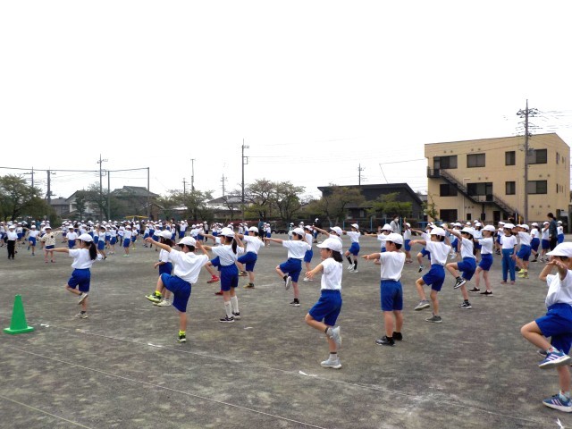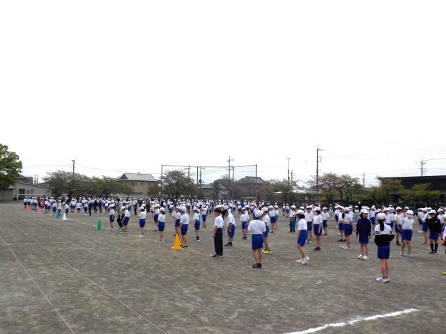 4月15日。今年度最初の体育集会です。今日は2~6年生が新しいクラスでの整列や体操の隊形に移動するための間隔を確認しました。5.6年生が見本を見せてくれたので全体での確認もスムーズにできました。また、これから実施する体力テストのソフトボール投げの投げ方も練習しました。