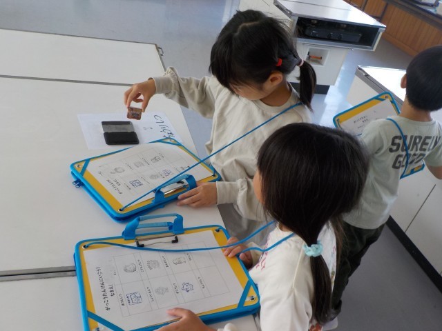 1年生は学校探検で、スタンプラリー形式で理科室、図工室、調理室、音楽室などの特別教室や職員室、校長室などをグループで探検しました。子どもたち同士で相談しながら場所を見つけたり時間をみながら移動したりして、各教室にどんなものがあるのか興味津々で見学していました。