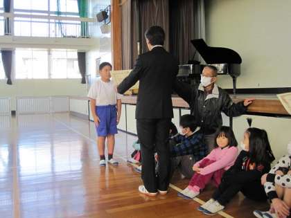 本日朝の集会で、夏休みから冬休みの間に、多方面でがんばってくれた児童に届いている賞状を伝達しました。下の写真は、「平成26年度 よい歯と口の学級表彰」で表彰された5年2組代表児童の表彰の様子です。