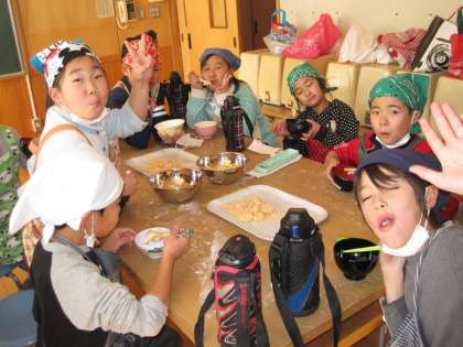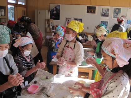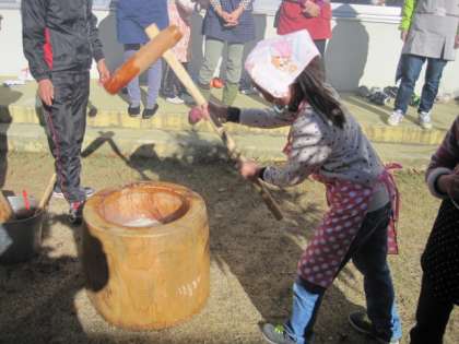 12月18日(木)は、総合的な学習で取り組んでいる米作りの最後の行事として、もちつきを行いました。当日は、風が冷たく朝から寒い日となりましたが、お手伝いボランティアとして保護者の方々が早くから準備をしてくださいました。子ども達は、きねでもちをつき、そして、お土産用のあんこもちを作り、きなこや醤油、辛み大根で味付けしたおもちをたくさん食べて、大満足でした(^_^) 初めてもちつきをした子ども達もいて、とても貴重な体験ができました。
