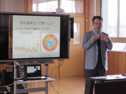「地球温暖化と省エネルギー」、「食料とごみ問題」、「水の恵みについて」など、わかりやすい資料と共に2時間たっぷりお話ししていただきました。子ども達は、片亀さんご自身が実践しているエコライフの話に、熱心に聞き入っていました。