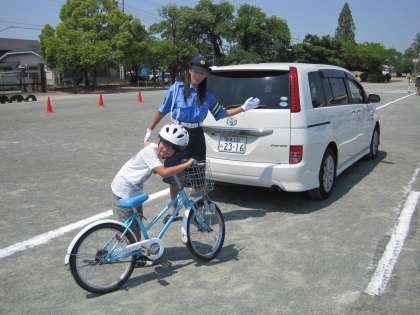 子どもたちの中には初めて自転車に乗った子も多く、はじめはなかなか上手に乗れず、戸惑いの表情も見られましたが、慣れてくると教えてもらったことを守ってしっかり乗れるようになりました。乗り終わった後の子どもたちの表情からも自分の安全は自分でしっかり守ろうとする意識が高まった様子でした。