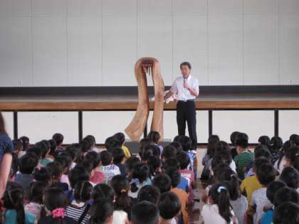 6月8日の朝、学校朝礼が行われました。今日は校長先生から美術作品の鑑賞についての話がありました。校長先生が実際に自分で制作した作品を紹介しながら、作品に込められた思い、作品の見方などをわかりやすくていねいに教えてくれました。