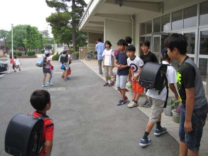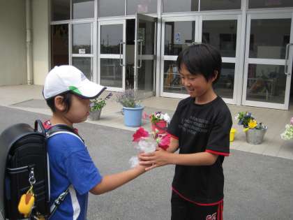 6月16日の朝、児童会の役員によるスマイルフラワー運動が行われました。この運動は児童にお花を持ってきてもらい、校舎内をお花でいっぱいにしようという活動です。今朝は児童会の役員が元気よく「おはようございます!」のあいさつで迎え、お花を持ってきてくれた児童からたくさんのお花を受け取っていました。