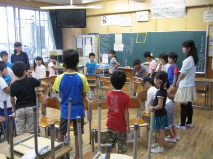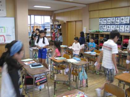 7月3日の朝、たてわり班活動が行われました。あいにくの雨でしたが、事前に各班の6年生が晴れの場合と雨の場合の活動を決め、各クラスに連絡してあったため、時間通りに活動することができました。