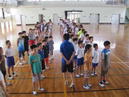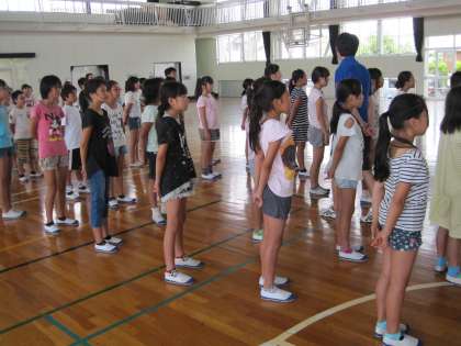 7月15日の4校時に5年生全体で体育館で臨海学校に向けて歌の練習をしました。今日は校歌、燃えろよ燃えろ、ビリーブなどをくりかえし練習しました。最初は暑さに負けて声が出ない様子でしたが、繰り返し練習するうちに声が出るようになり、最後には元気いっぱい声を出すことができました。