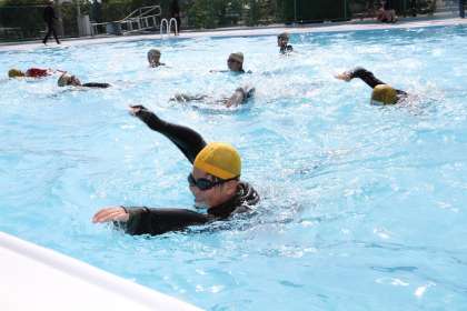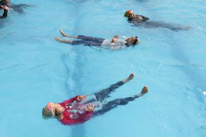 プールの中を実際に歩いたり、泳いでみることであらためて服を着たままだと水中ではかなり動きが制限されることに驚いている様子でした。またペットボトルを抱えて水中で浮く体験もし、万一の場合でも落ち着いて対応できるように練習しました。