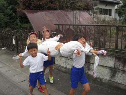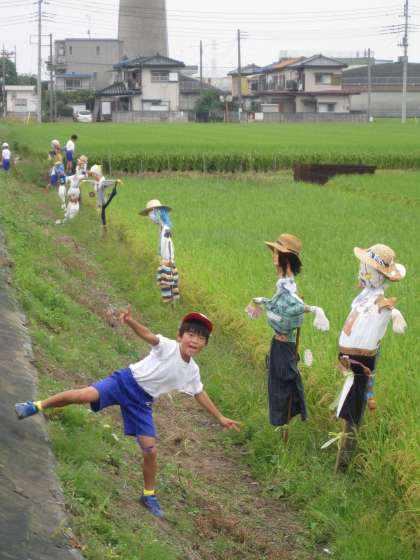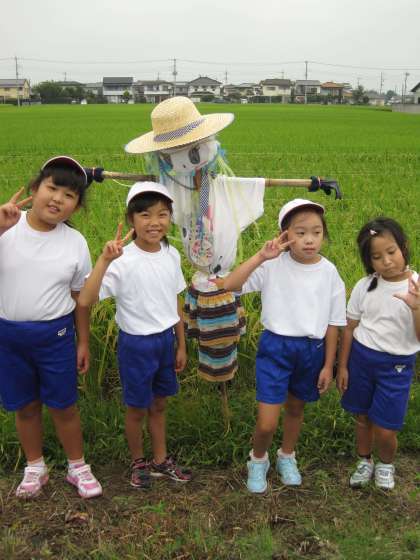 24日(木)、雨天が続いていてなかなか行けなかったかかし立てに行ってきました♪子ども達は、グループごとに工夫を凝らして作ったかかしを大事そうに田んぼまで運び、事前に羽鳥さんに準備しておいていただいたポールに固定しました。そして、グループごとに写真を「パチリ☆」これから稲刈りまで、このかかし達にしっかりと田んぼを守ってもらいます。機会がありましたら、ぜひご覧ください。