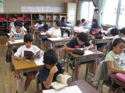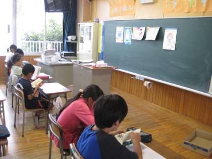 10月1日の5,6校時に5年生が読書感想画を描きました。まだ描きたい場面が決まっていない子はじっくり本を読んでいました。すでに描き始めている子はテレビ画面で模範例を見ながら、自分の頭の中に想像した場面を画用紙いっぱいに描いていました。