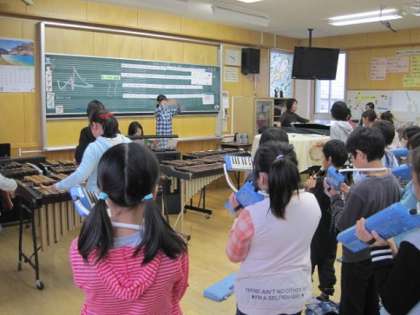 合奏の練習でもはじめはどうしてもリズムが速くなってしまい、打楽器とリコーダーが合わない様子でしたが、音楽の先生の手拍子に合わせることで少しずつ合うようになってきました。