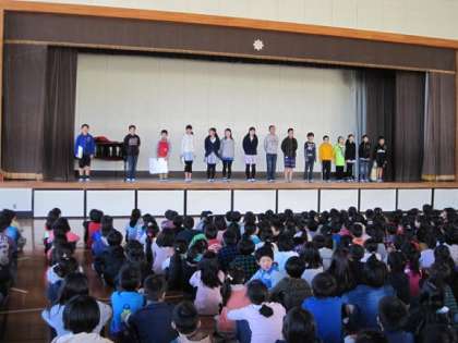 12月4日の児童集会で環境整美委員の発表が行われました。発表では委員会の仕事の紹介やリサイクルされる牛乳パックやペットボトル、委員会で収集しているプルトップについてのクイズ、掃除のしかたの劇などがありました。