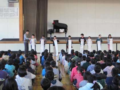 続いて4〜6年生の各クラスから選ばれた男女1名ずつの児童が人権標語の発表をしました。「さすがクラスの代表!」と思えるすばらしい標語を紹介してくれました。