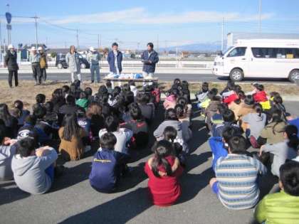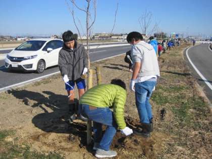 1月27日に6年生が植樹作業を行いました。作業では6年生全員が土木事務所の方の指導で、学校近くの国道の沿道に2人で一本の木を植えました。