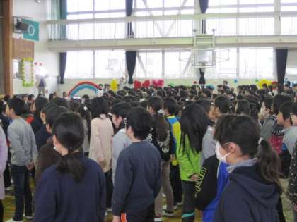 1月29日の朝、体育館でありがとうの会が行われました。この会ではいつもお世話になっている交通指導委員のみなさん、読み聞かせボランティアのみなさん、放課後支援のみなさん、声かけボランティアのみなさんに感謝の気持ちを込めてお手紙や手作りのメダル、そして全校児童による歌をプレゼントしました。