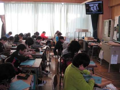 すでに板への下書きは終わっているようで、静まりかえった教室では彫刻刀を使って真剣に児童が彫り進めていました。また時々担当の先生がパソコンを使って、模範的な版画作品をテレビに映し出し、児童が参考にできるようにしていました。