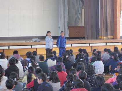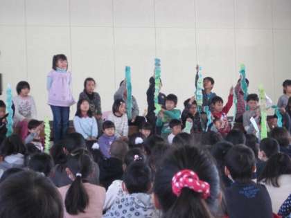 6年生を送る会1 公開日 2016/02/25 更新日 2016/02/25 お知らせ 2月25日の午前中に6年生を送る会が行われました。今回は3年生一クラスが学級閉鎖のため参加できませんでしたが、それぞれの学年が素晴らしい発表をしてくれました。 1年生はスライドと歌で1年間の様子を伝える「はる なつ あき ふゆ」、2年生は群読「スイミー」の発表でした。どちらの学年も元気いっぱいの素晴らしい発表でした。