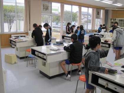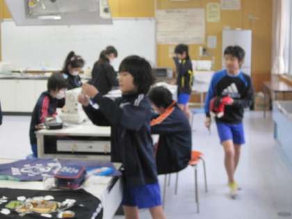 3月9日の3校時の様子です。5年生のクラスが家庭科の授業でエプロンづくりに取り組んでいました。