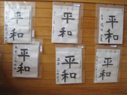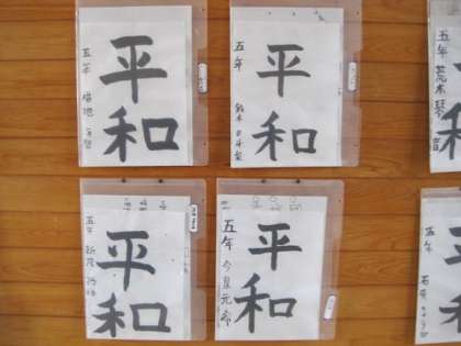 5年生の教室前の階段に習字の作品が飾られていました。このクラスは全員で40人ととても多く、たくさんの「平和」の文字が飾られていました。