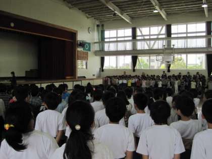 5月6日の朝、体育館で音楽集会が行われました。今日は校歌と「ともだちになるために」を全校で歌いました。