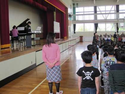連休明けということではじめはなかなか声が出ない様子でしたが、学年ごとにわかれて歌ったり、パートごとにわかれて歌うと、とてもきれいな歌声になりました。全校児童のみなさんも気持ちよく歌ったので休み気分がすっかり抜けた様子でした。伴奏を担当した3人の6年生もさすが「学校の代表!」と思える上手な伴奏でした。本当にありがとうございました。