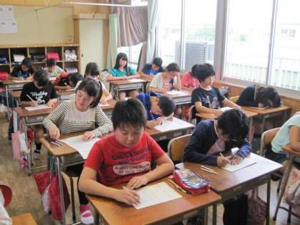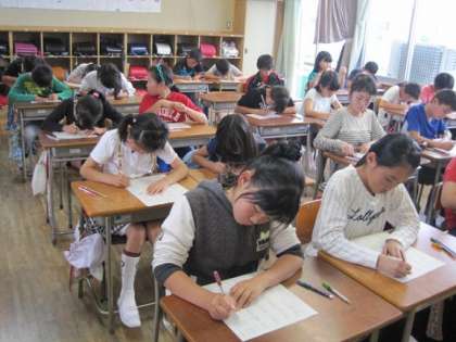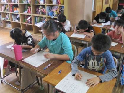 どの子も熱心に書いていましたが、書いているうちに自然と前屈みになってしまう子もいたようで、時々気がついた子は姿勢を直して書いていました。また中には最後まで姿勢を崩さすしっかり書けていた子もいました。
