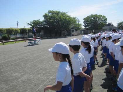 5月18日の朝、校庭で体育集会が行われました。今日は天気もよく、体育集会を行うにはとてもよい日でした。
