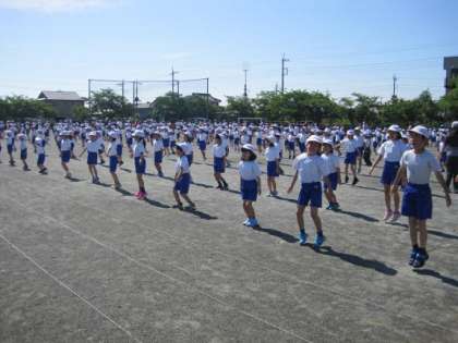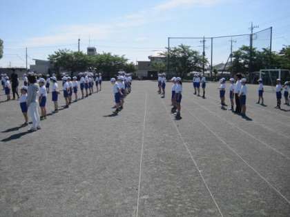 はじめに体育主任から整列の仕方の確認と、体操の隊形への移動の仕方のお話があり、その後、実際にそれぞれの場所に移動しました。久しぶりの体育集会だったせいか、はじめはあまり声が出ず、動きもゆっくりになってしまいましたが、再度集まり、体育主任から「しっかり声を出すこと」を伝えられると、2回目は元気よく声を出すことができました。その後の準備体操でも元気なかけ声をかけながらしっかり体を動かすことができました。