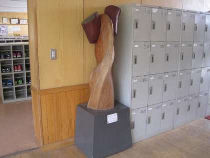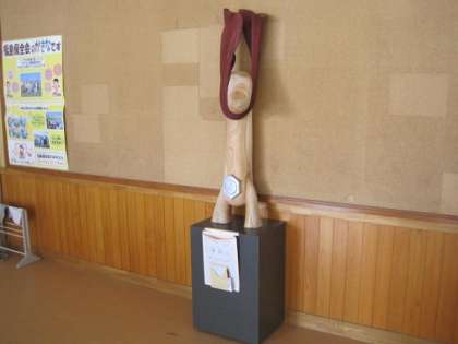 玉村小学校の児童玄関前には芸術作品が置かれています。木に彫られた大きな作品ですが、作品名がないものもあります。そのため児童が作品を鑑賞して、考えた名前を入れられるようにもなっています。