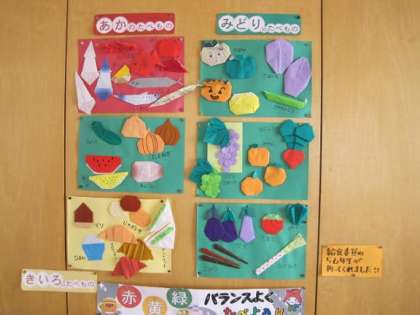 校内の掲示物 公開日 2016/05/27 更新日 2016/05/27 お知らせ 1,2年生の教室前の廊下に給食に関する掲示物がありました。これは給食委員の児童が栄養素について1,2年生にもわかるように色画用紙を折って作ってくれたもので、色とりどりの野菜やご飯、お魚などがきれいに飾られていました。 給食委員のみなさん、とても素晴らしい掲示物をありがとうございました!