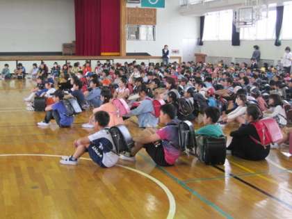 5月30日の5校時に集団下校訓練が行われました。今日はあいにくの雨のため校庭ではなく、体育館に集合し、その後、下校をしました。