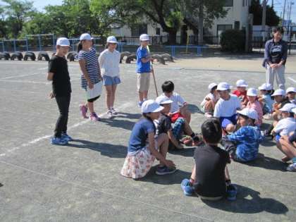 6月3日の朝、たてわり班活動が行われました。今日が実際に外や体育館で初めて活動する日でした。