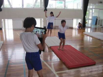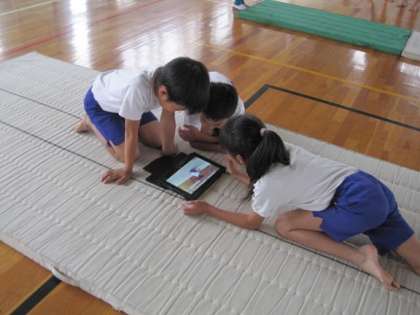 練習では10台のタブレットをグループごとに使い、自分たちの演技を撮影して改善点を確認しながら、一人一人がよりよい演技を目指してがんばっていました。偶然昨年の上級生の上手な演技の映像データが残っていたタブレットがあったようで、先輩たちの演技も参考にしているグループもありました。