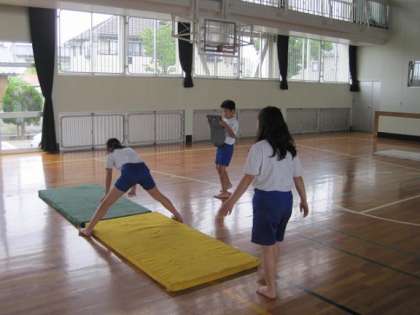 6月7日の6校時の授業の様子です。5年生は体育館でマット運動を行っていました。演技の発表会に向けて40人が4人ずつで10グループに分かれ、グループごとに練習に励んでいました。
