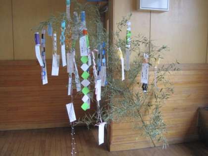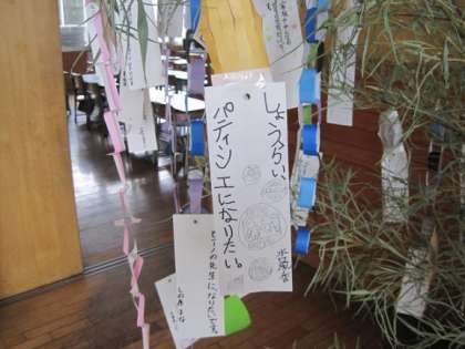 3年生の教室の前にきれいな七夕の飾りがありました。クラスのみなさんの願い事も書笹の葉についていました。