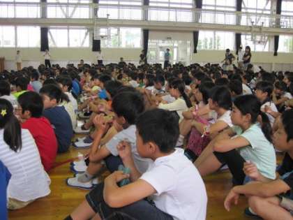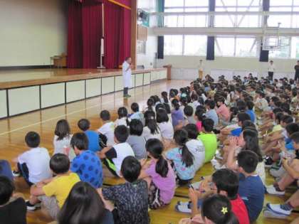 6月24日の朝、体育館ではみがき集会が行われました。今日は校医の先生に来ていただき、歯みがきの仕方についてお話をしていただきました。