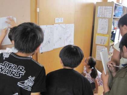事前に家から持ってきた産地が書かれた資料を元に、地図を作り、今回は米、野菜、果物、畜産物、水産物の5つの食物について気がついたことを発表し合いました。5年生は地図から多くのことに気がつくとともに、「なぜ〜なのか」といった自分なりに感じた疑問点についてもまとめることができました。