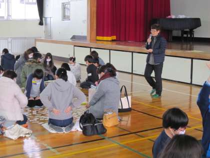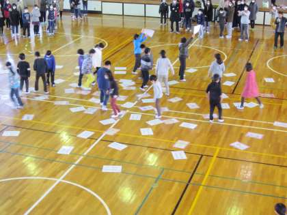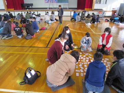 ■4年生の親子行事で「人権カルタ」を行いました。講師に関口信子先生をお招きし、通常判「人権カルタ」と大判「人権カルタ」を小グループに分かれて行いました。通常判はグループで輪になって、関口先生が読み上げた読み札と絵札を取り合います。大判では、体育館の中央に画用紙大の読み札と絵札を広げて、体育館の四隅から各グループの1人が探しに行くやり方です。後半の大判は大変盛り上がって、寒い体育館も熱気に溢れ盛り上がりました。人権に関わった読み札の言葉を聞いて、どんな言葉が印象に残ったでしょうかね。