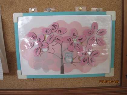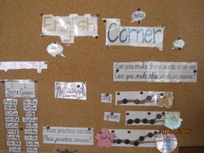 今回はアルファベットに関する掲示物で、大文字と小文字の違いなどがとてもわかりやすく紹介されていました。