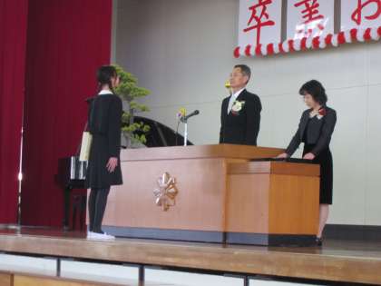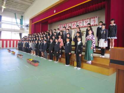 ★朝の卒業式開始前に1〜3年生とお別れ式が行われました。卒業式に参加しない1〜3年生達が言葉と歌を贈りました。心温まる和やかな一時でした。卒業式では、6年生83名が玉小を巣立ちました。立派な返事とともに堂々とした姿で卒業証書を授与されました。在校生と卒業生の素晴らしい言葉と歌にも感動しました。来賓の皆様からは「よかったよ」とたくさんのお褒めの言葉を頂きました。卒業生の今後の飛躍に期待しています。