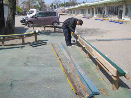 ★休日を返上して、本校卒業生のお父さん方による「おやじの会」が、今年も校庭の遊具等を補修してくれました。砂場の砂が少なくなっていたり、固まっていたので、ショベルカーで砂を入れたり、掘り起こしてくれました。また、木もれ日広場のベンチの板が割れてなくなっていたので、新しい板に交換して、きれいにペンキを塗ってくれました。