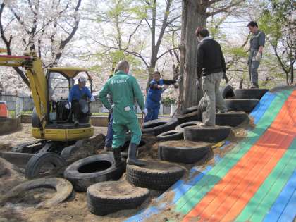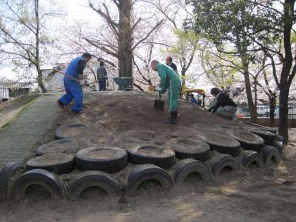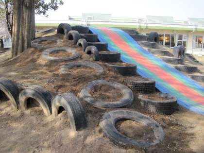 ☆小校庭の大すべり台も、土が雨で流れてしまったり、丸太がなくなっていたので、大小のタイヤを皆さんで力を合わせて持ち上げて、きれいに並べてくれました。またショベルカーやスコップで、たくさんの量の土を敷きつめてくれました。おかげで、素晴らしくリニューアルされて、楽しく遊ぶことができそうです。「おやじの会」の皆さん、1日中本当にお疲れ様でした。また、大変ありがとうございました。大切に使っていきたいと思います。