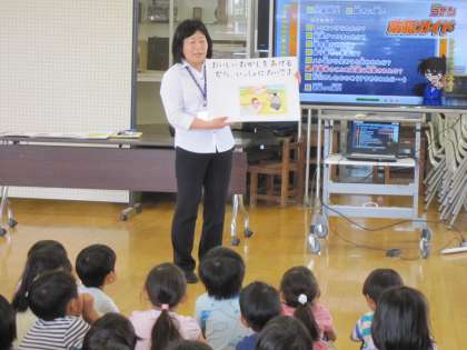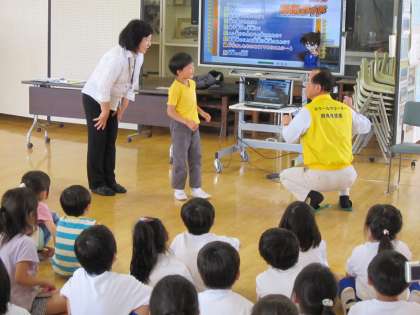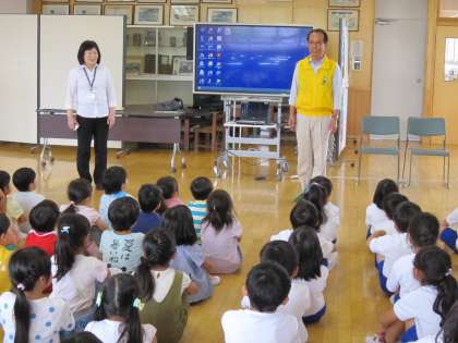 ■毎年、1年生のこの時期に「防犯教室」を行っています。今回は、伊勢崎警察署スクールサポーターの畑さん、県庁県民防犯係の伊藤さんが来て下さりました。子供達に「変な人に追いかけられたら」「車から道を聞かれたら」「留守番中に知らない人が来たら」こんな場面でどうに対応したらよいかを、映像を見ながら確かめました。子供達も実際にやってみました。また、「断り方」のパターンもいくつか紙芝居で確かめました。この防犯教室の勉強が子供達自身の身の安全を守る事につながればと。家庭でも「こんな時」の約束を決めておいて下さいね。