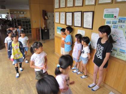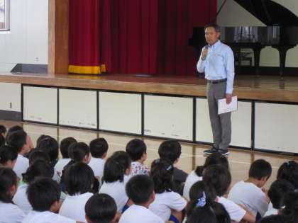 ★今日は今年最初の朝礼。最初に校歌の一番を斉唱。校長先生から2つのお話がありました。1つ目は、「めあてや目標」について。2つ目は、今年の玉小のスローガン「夢叶える玉小」をみんなで力を合わせて創って行くこと。最後に、注意で不審者からの声かけがあったらどうするかをお話ししました。教室に戻る際には「ハッピーあいさつ運動」の第2弾。この日のハッピーあいさつ当番のみんなが廊下に立って戻ってくる子供達にあいさつの声かけを頑張りました。