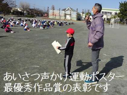 ★集会の後に「玉村町あいさつ声かけ運動」ポスターコンクールで最優秀作品賞を受賞した1年生の新井くんの表彰を行いました。おめでとうございます。