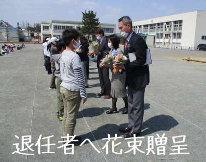 ★続けて「離退任式」3月末で玉小を去られる先生14名が紹介され、子ども達から花束贈呈を行い、最後に1人1人ご挨拶をいただきました。お話の内容や異動先は4月の玉小っ子で紹介されると思います。